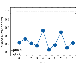>>> from torch import rand, randint >>> # Example plotting multiple values >>> from torchmetrics.classification import BinaryCalibrationError >>> metric = BinaryCalibrationError(n_bins=2, norm='l1') >>> values = [ ] >>> for _ in range(10): ... values.append(metric(rand(10), randint(2,(10,)))) >>> fig_, ax_ = metric.plot(values)