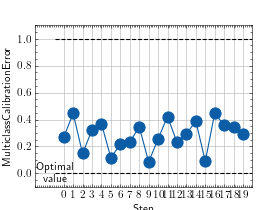 >>> from torch import randn, randint >>> # Example plotting a multiple values >>> from torchmetrics.classification import MulticlassCalibrationError >>> metric = MulticlassCalibrationError(num_classes=3, n_bins=3, norm='l1') >>> values = [] >>> for _ in range(20): ... values.append(metric(randn(20,3).softmax(dim=-1), randint(3, (20,)))) >>> fig_, ax_ = metric.plot(values)