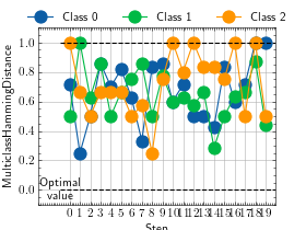 >>> # Example plotting multiple values >>> from torch import rand, randint >>> from torchmetrics.classification import MultilabelHammingDistance >>> metric = MultilabelHammingDistance(num_labels=3) >>> values = [ ] >>> for _ in range(10): ... values.append(metric(randint(2, (20, 3)), randint(2, (20, 3)))) >>> fig_, ax_ = metric.plot(values)