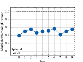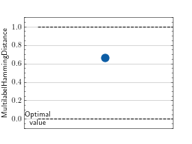 \[\text{Hamming distance} = \frac{1}{N \cdot L} \sum_i^N \sum_l^L 1(y_{il} \neq \hat{y}_{il})\]Where \(y\) is a tensor of target values, \(\hat{y}\) is a tensor of predictions, and \(\bullet_{il}\) refers to the \(l\)-th label of the \(i\)-th sample of that tensor.