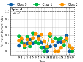 >>> # Example plotting a multiple values per class >>> from torch import randint >>> from torchmetrics.classification import MulticlassJaccardIndex >>> metric = MulticlassJaccardIndex(num_classes=3, average=None) >>> values = [] >>> for _ in range(20): ... values.append(metric(randint(3, (20,)), randint(3, (20,)))) >>> fig_, ax_ = metric.plot(values)