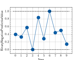>>> from torch import rand, randint >>> # Example plotting multiple values >>> from torchmetrics.classification import BinaryNegativePredictiveValue >>> metric = BinaryNegativePredictiveValue() >>> values = [ ] >>> for _ in range(10): ... values.append(metric(rand(10), randint(2,(10,)))) >>> fig_, ax_ = metric.plot(values)