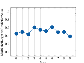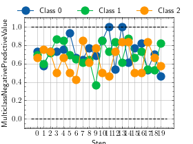 >>> from torch import rand, randint >>> # Example plotting multiple values >>> from torchmetrics.classification import MultilabelNegativePredictiveValue >>> metric = MultilabelNegativePredictiveValue(num_labels=3) >>> values = [ ] >>> for _ in range(10): ... values.append(metric(randint(2, (20, 3)), randint(2, (20, 3)))) >>> fig_, ax_ = metric.plot(values)