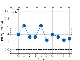 >>> from torch import rand, randint >>> # Example plotting multiple values >>> from torchmetrics.classification import BinaryPrecision >>> metric = BinaryPrecision() >>> values = [ ] >>> for _ in range(10): ... values.append(metric(rand(10), randint(2,(10,)))) >>> fig_, ax_ = metric.plot(values)