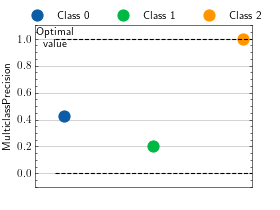 >>> from torch import randint >>> # Example plotting a single value per class >>> from torchmetrics.classification import MulticlassPrecision >>> metric = MulticlassPrecision(num_classes=3, average=None) >>> metric.update(randint(3, (20,)), randint(3, (20,))) >>> fig_, ax_ = metric.plot()