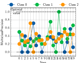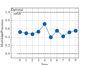 >>> from torch import rand, randint >>> # Example plotting multiple values >>> from torchmetrics.classification import MultilabelPrecision >>> metric = MultilabelPrecision(num_labels=3) >>> values = [ ] >>> for _ in range(10): ... values.append(metric(randint(2, (20, 3)), randint(2, (20, 3)))) >>> fig_, ax_ = metric.plot(values)