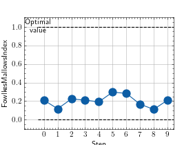 >>> # Example plotting multiple values >>> import torch >>> from torchmetrics.clustering import FowlkesMallowsIndex >>> metric = FowlkesMallowsIndex() >>> values = [ ] >>> for _ in range(10): ... values.append(metric(torch.randint(0, 4, (10,)), torch.randint(0, 4, (10,)))) >>> fig_, ax_ = metric.plot(values)